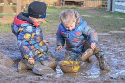 - We use natural materials such as sand and mud to promote discovery and imaginative play.
